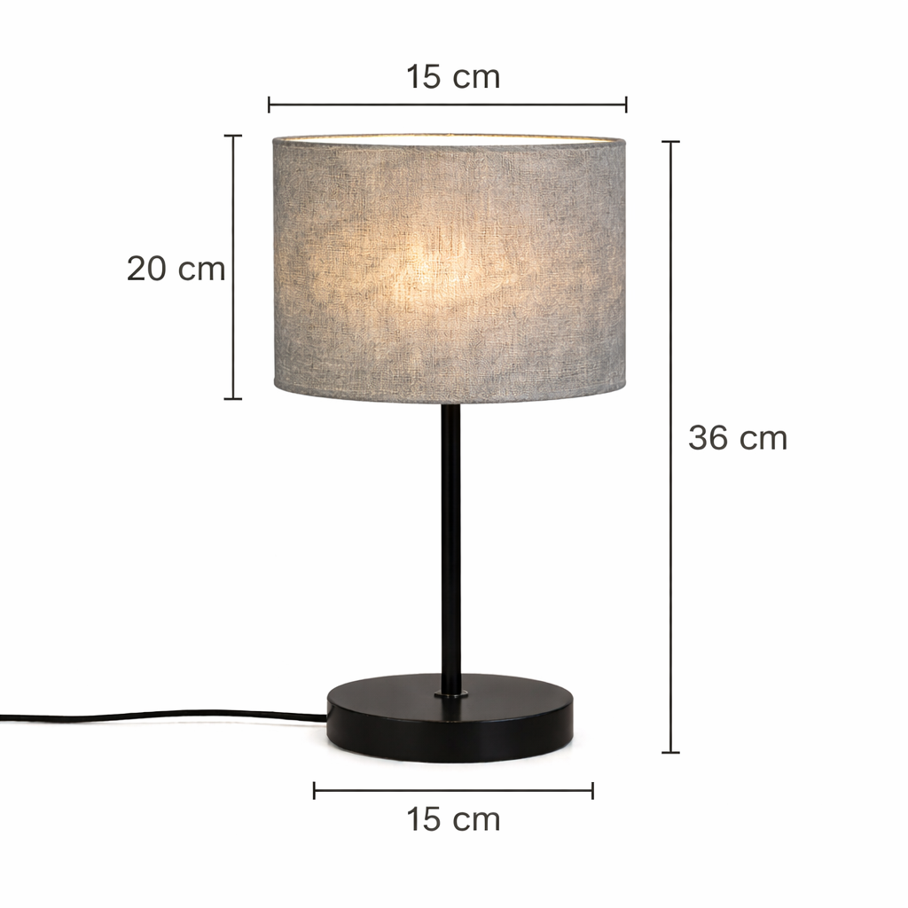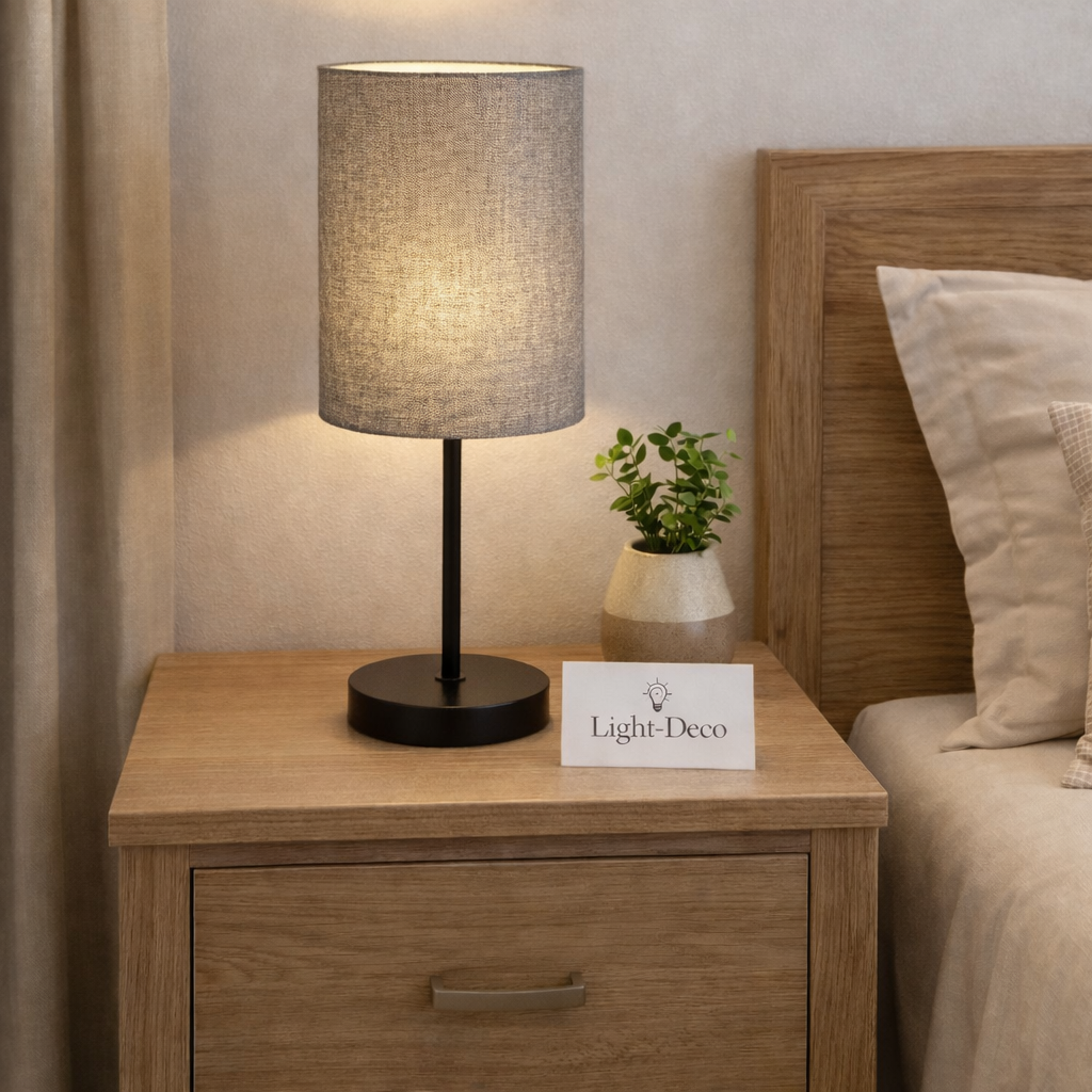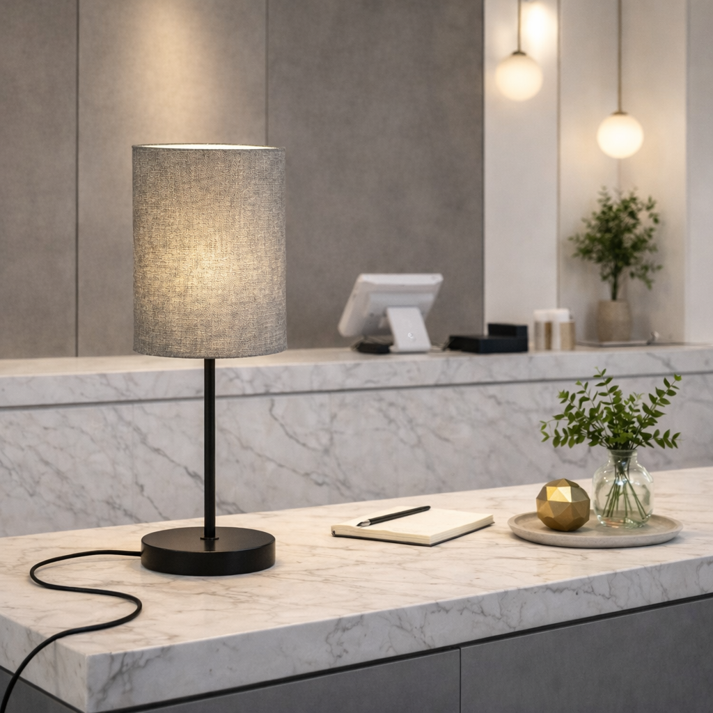 Lampe de table au design sobre et élégant, dotée d’un abat-jour cylindrique en tissu gris diffusant une lumière douce et chaleureuse. Son pied noir filaire assure stabilité et praticité. Idéale pour comptoir, table de chevet ou espace commercial moderne.