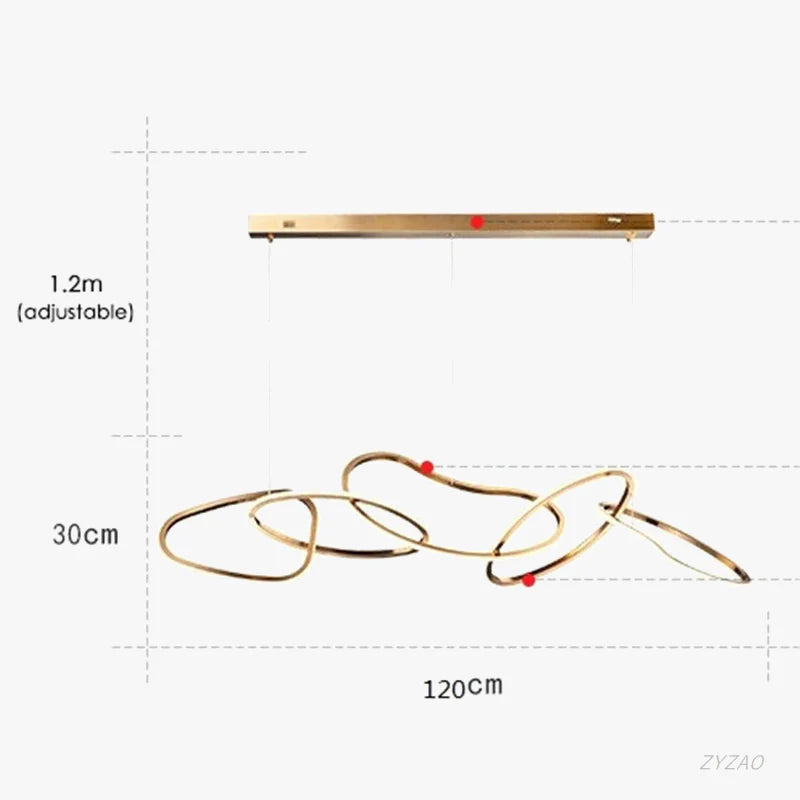 Ce lustre longiligne doré, composé de cinq cercles suspendus, est idéal pour une salle à manger moderne. Chaque anneau diffuse une lumière douce et élégante, créant une ambiance chaleureuse. Son design épuré et géométrique apporte une touche contemporaine et raffinée à l'espace.
