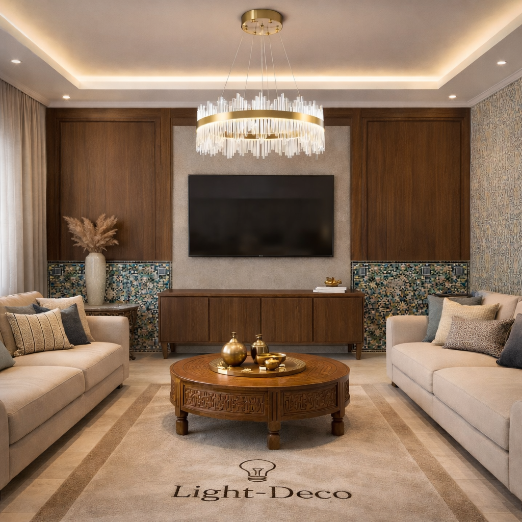 Le lustre style au style moderne, incontournable dans les salons marocains, allie élégance contemporaine et raffinement traditionnel. Sa lumière sublime l’espace avec éclat et glamour. Idéal pour le salon, la chambre ou le séjour, il apporte une touche de luxe et crée une atmosphère chaleureuse et sophistiquée.