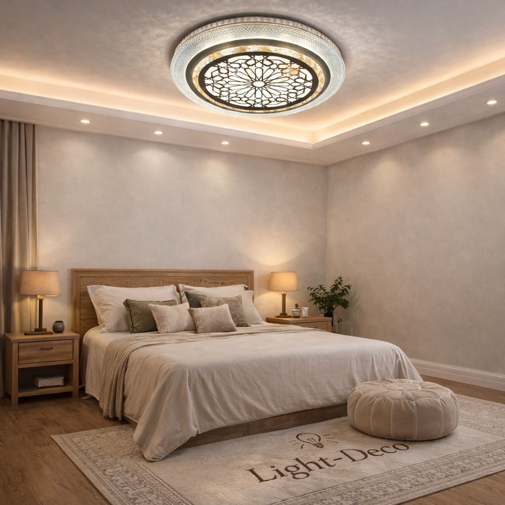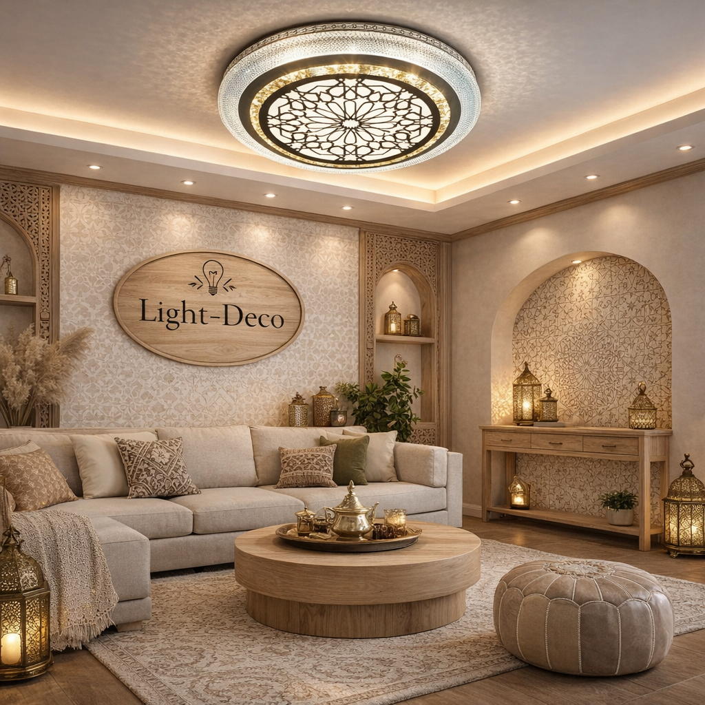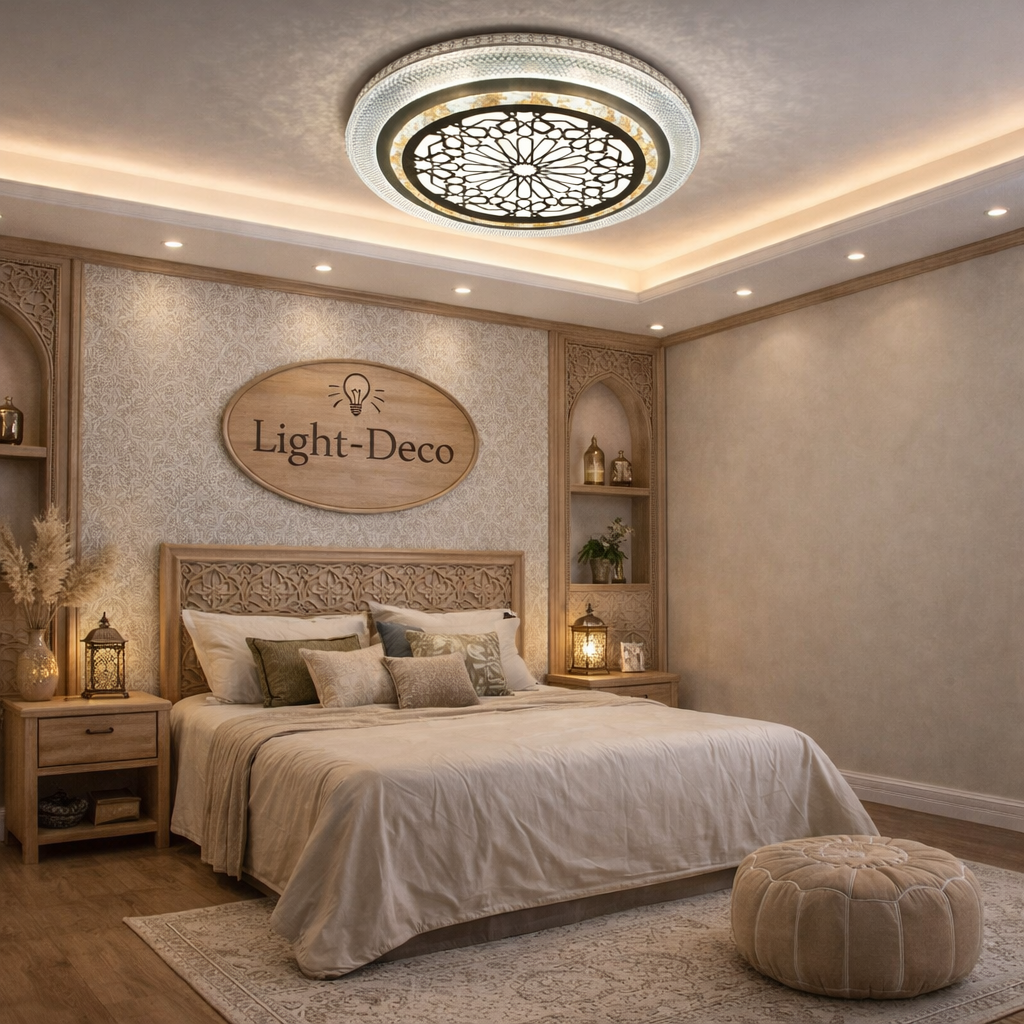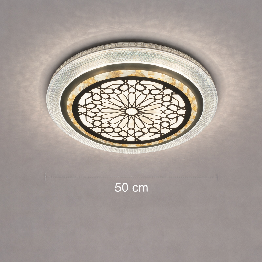 Plafonnier au design marocain contemporain, orné d’un motif géométrique finement découpé. Son diffuseur circulaire crée une lumière douce et homogène, idéale pour une ambiance chaleureuse. Avec son diamètre de 50 cm, il allie élégance, modernité et inspiration beldi.