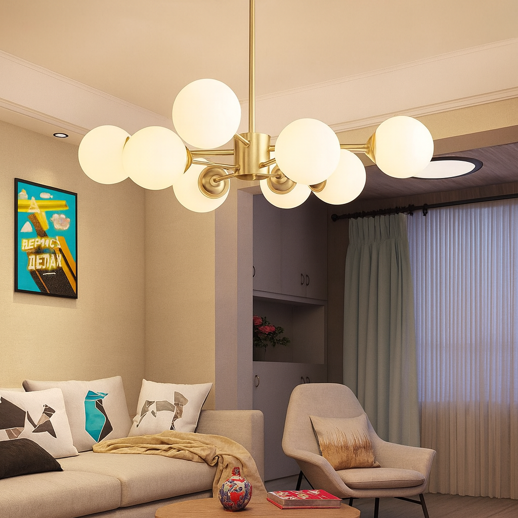 Ce qui caractérise ce Plafonnier 8 boules en verre, c'est qu'il a la polyvalence d'être coller au plafond ou suspendues légèrement par le billet de sa tige doré incluse dans le colis.