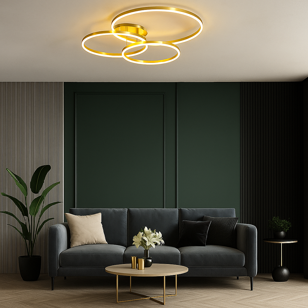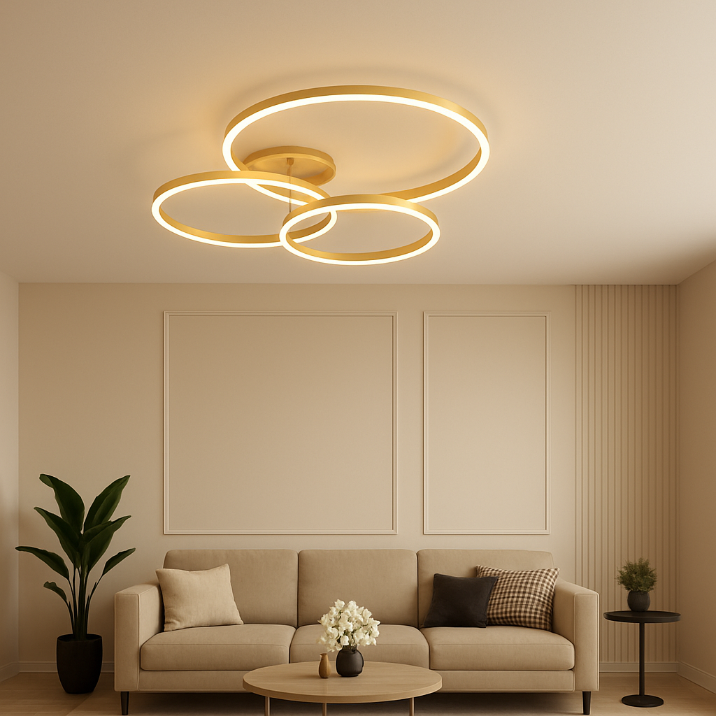 Ce plafonnier doré au design circulaire est idéal pour un salon de 9 à 20 m². Élégant et moderne, il diffuse une lumière harmonieuse qui met en valeur l’espace sans l’alourdir. Son allure raffinée en fait un véritable point focal, apportant chaleur et sophistication à votre intérieur.