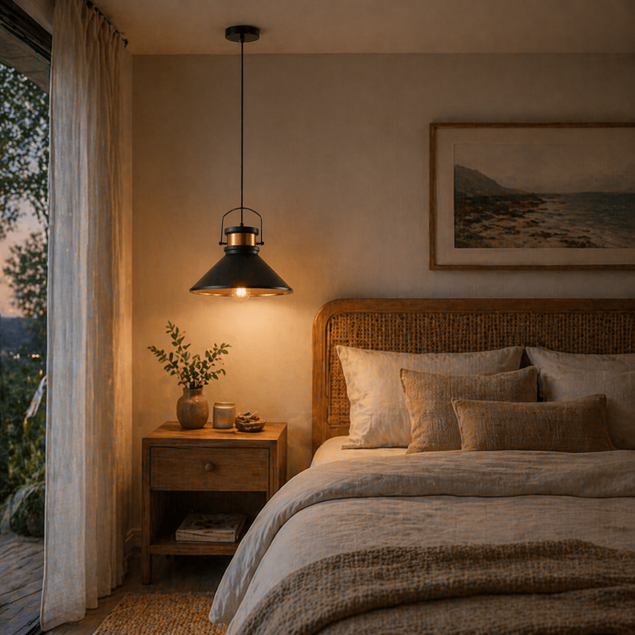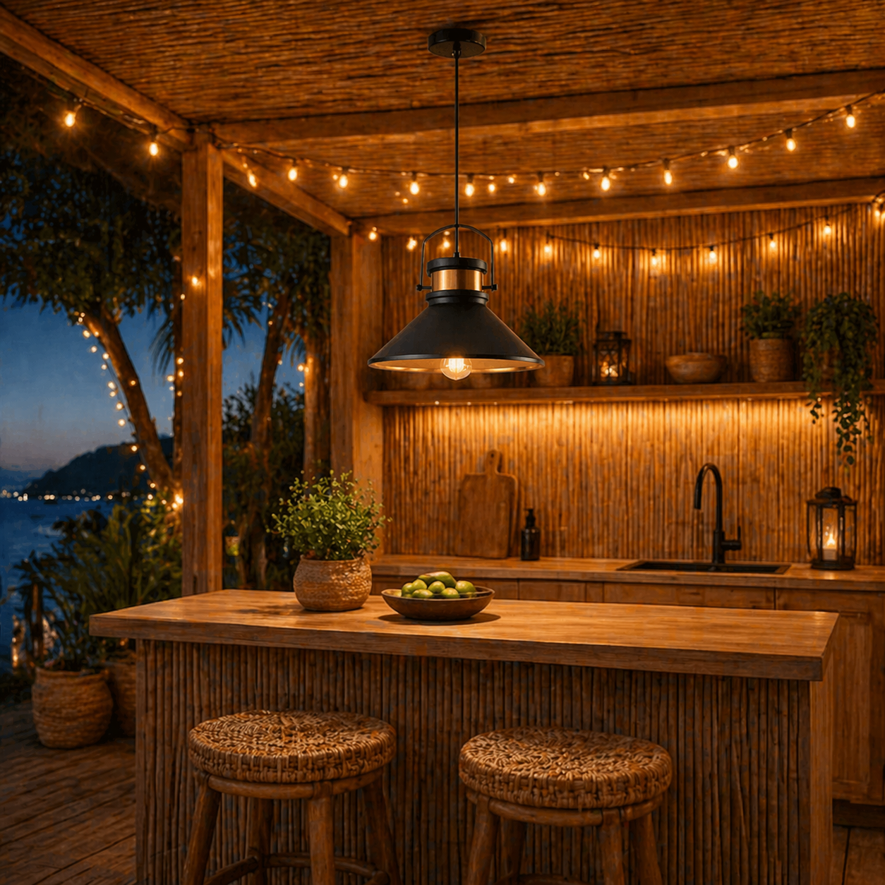 Suspension industrielle au design épuré en métal noir et finition dorée, idéale pour intérieur et extérieur. Hauteur ajustable jusqu’à 100 cm, elle diffuse une lumière chaleureuse grâce à son ampoule E27. Parfaite pour cuisine, terrasse ou salle à manger avec style moderne.