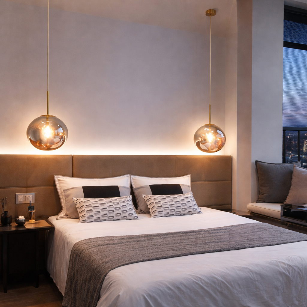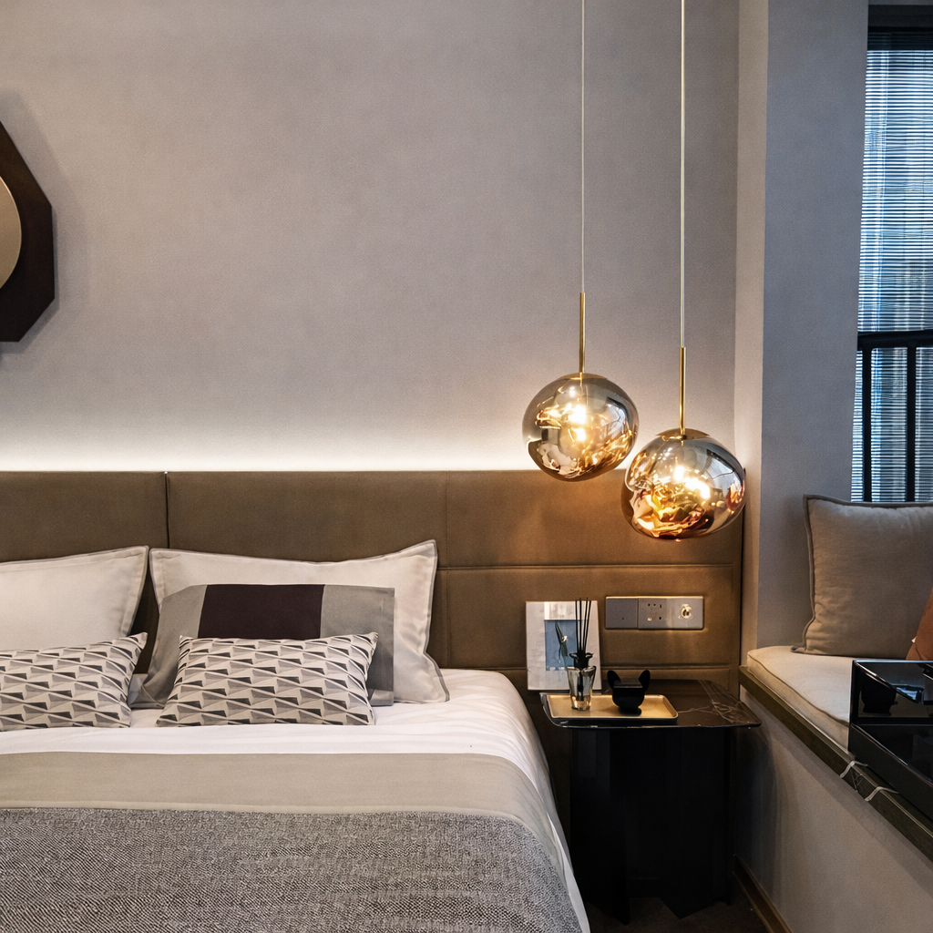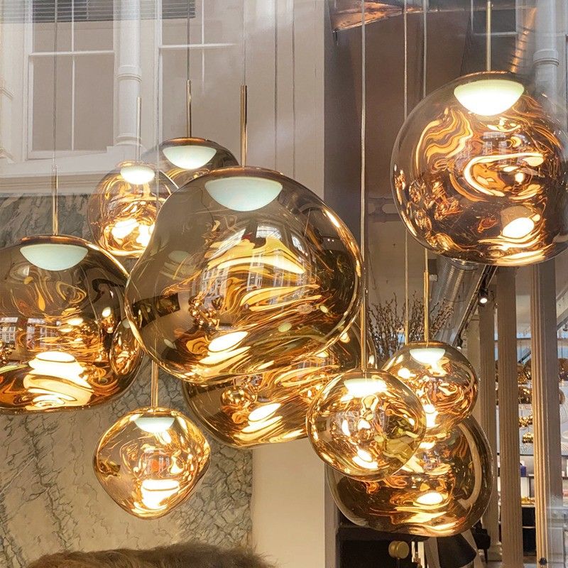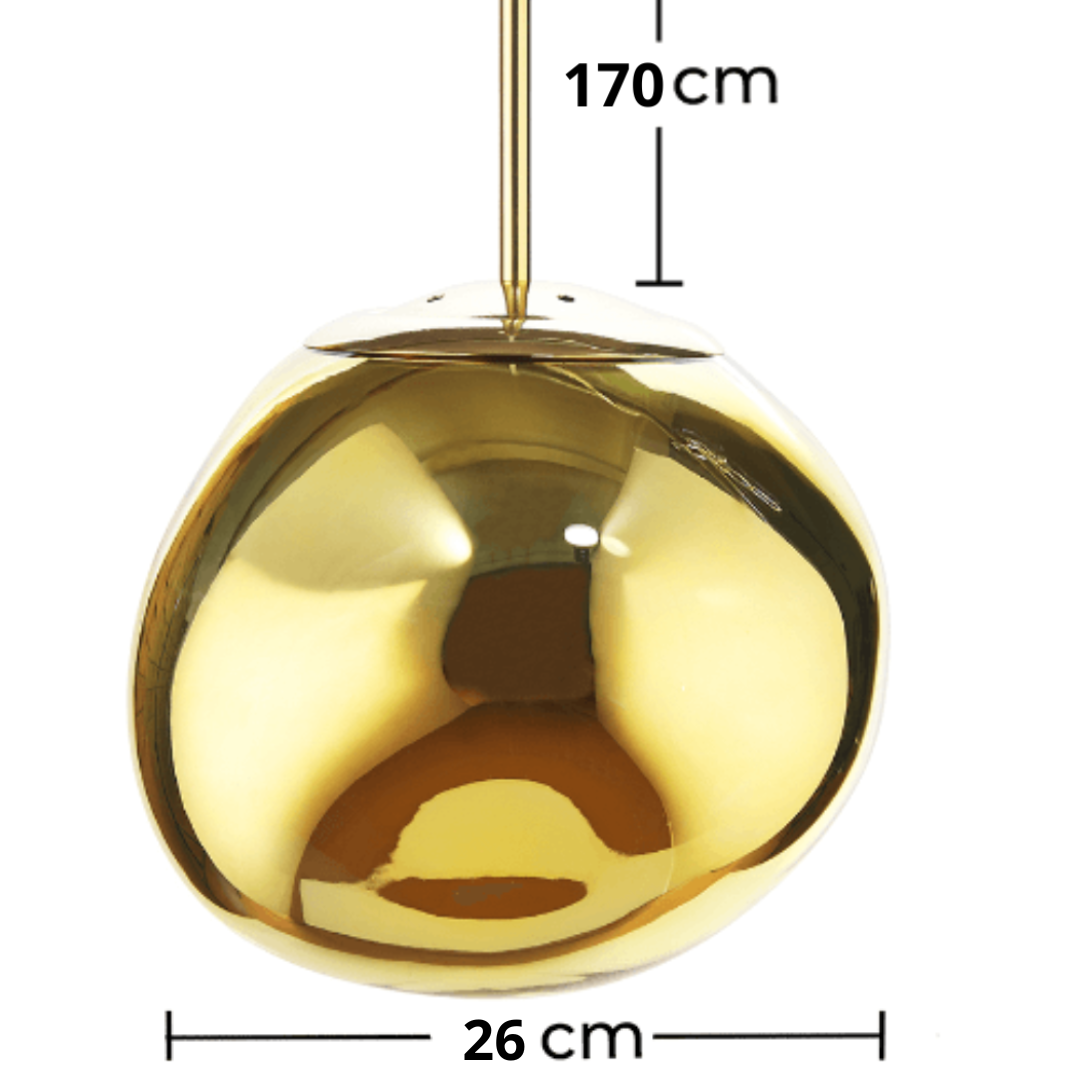 Suspension dorée à effet miroir, au design moderne et lumineux. Son verre métallisé reflète l’espace et crée des jeux de lumière élégants. Idéale pour apporter chaleur, sophistication et une touche luxueuse à tout intérieur contemporain.